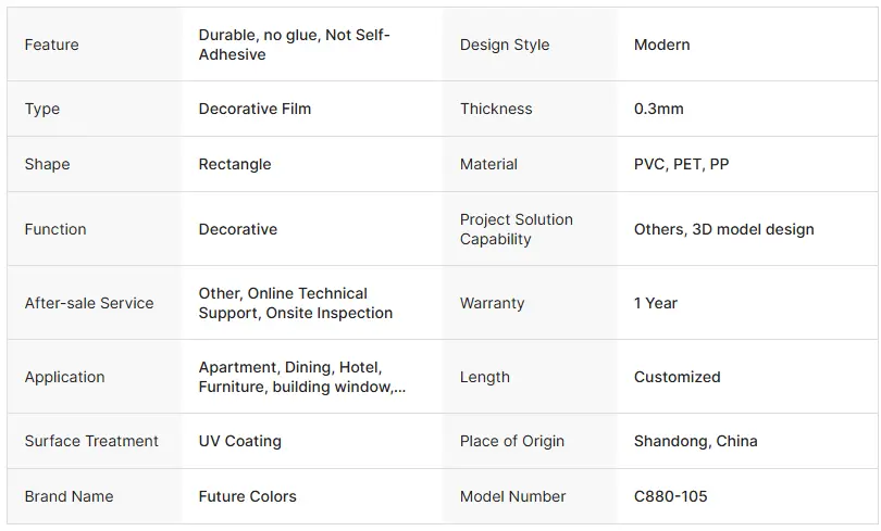 جديد رنگن جي برفاني فلم هڪ آرائشي فلم آهي جيڪو بنيادي مواد کي بنيادي مواد طور استعمال ڪندو آهي. رنگين ۽ ڪوٽنگ جو علاج ڪرڻ کان پوء، اهو "بلڊنگ پروسيس" ذريعي چپيندڙ حاصل ڪري ٿو اهو خصوصيتون "يونيفارم رنگ، ۽ وڌندڙ پلاسٽڪ جي اثرائتي"، ۽ وڏي پئماني تي استعمال ٿيل آهن، جهڙوڪ فرنيچر، سجاڳي ۽ پيڪنگنگ، سجاڳي. اهو جديد طور تي استعمال ٿيندڙ مواد جديد طور تي استعمال ٿيل مواد جي جديد انداز واري ترتيب ۾ آهي.