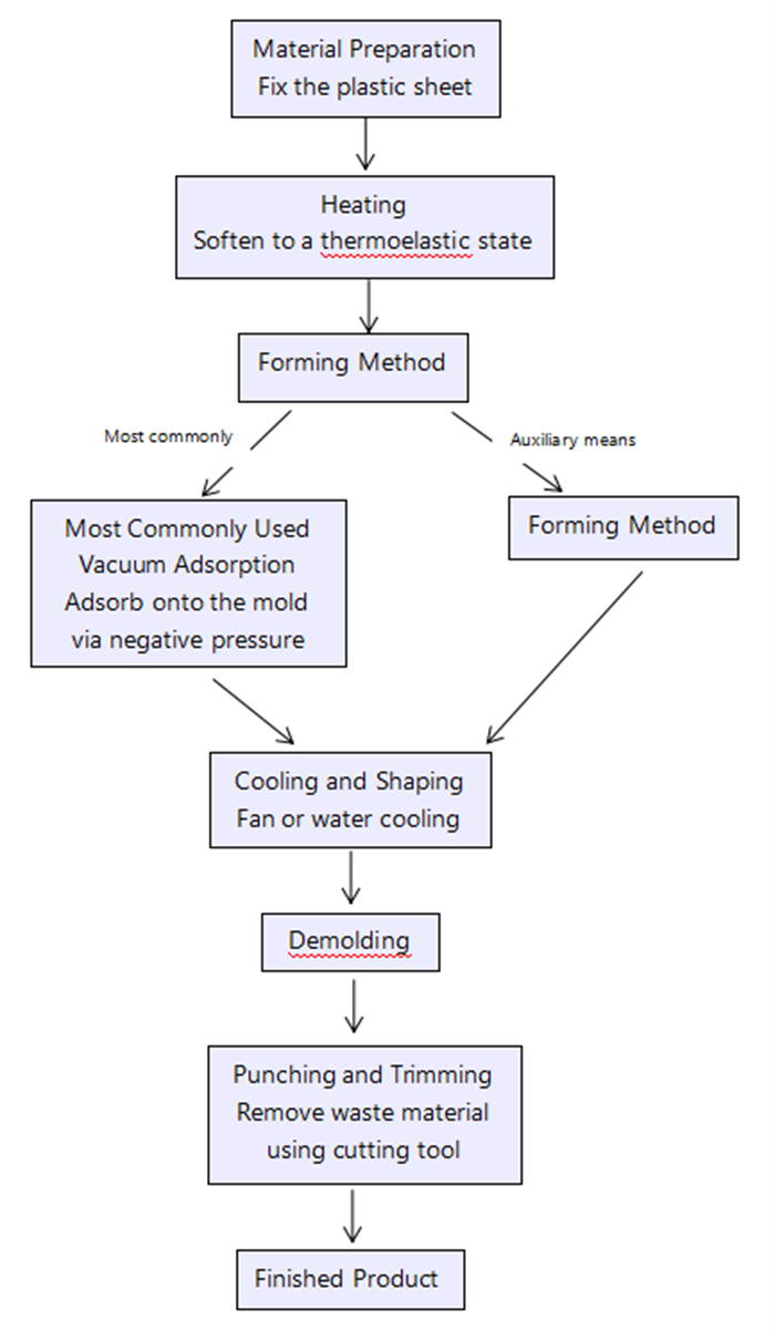 بنيادي اصول: پلاسٽڪ جي شيٽ کي گرم ۽ نرم ڪريو، پوءِ ان کي مولڊ جي مٿاڇري تي جذب ڪرڻ لاءِ ويڪيوم استعمال ڪريو، ۽ اهو ٿڌي ٿيڻ کان پوءِ شڪل اختيار ڪندو.